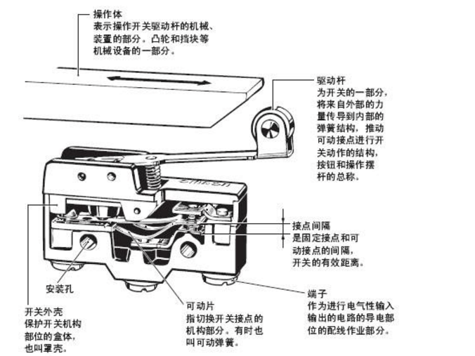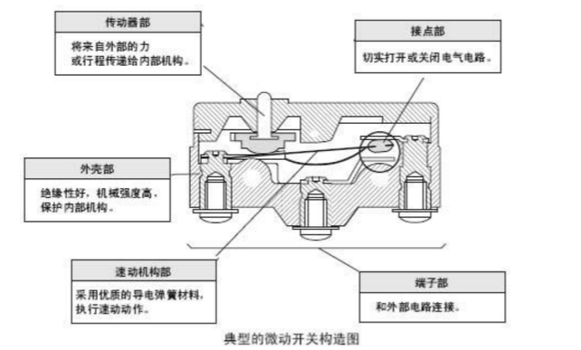 微動開關具有微小接點間隔和速動機構,用規定的行程和力進行開關動作的接點機構,被外殼覆蓋, 其外部有傳動器,且外形較小。下圖為典型的微動開關構造的一個示例。