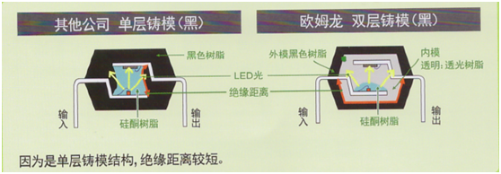 歐姆龍MOS FET繼電器高絕緣型雖然采用了黑色樹脂,但由于是雙層鑄模構造,因此可確保較長的絕緣距離,實現了高絕緣性。DIPSOP系列產品新增黑色封裝,DIP:支持AC5000VSOP:支持AC3750V