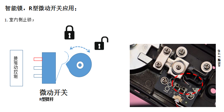 但除了這種常規(guī)的直擺桿型微動開關(guān), 還有一種R型擺桿的微動開關(guān)也在智能鎖里應(yīng)用; 見下圖; R型擺桿的微動開關(guān), 用在室內(nèi)側(cè), 類似于反鎖的機(jī)制;事實(shí)上不是反鎖, 該功能叫“室內(nèi)側(cè)止鎖”, 用于防止屋內(nèi)側(cè)的寵物或小孩,不經(jīng)意觸到把手, 而把鎖打開, 而此時大人/主人又不在現(xiàn)場, 繼而產(chǎn)生不安全的存在。
