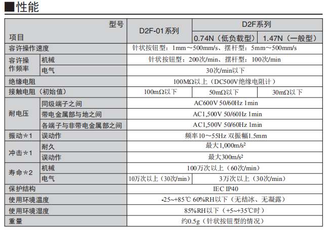 歐姆龍微動開關D2F系列產品性能: