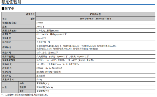 歐姆龍B5W-DB的光源為紅外發(fā)光二極管(850nm),受光面照度在白熾燈的情況下為3,000lx以下、太陽光的照度下為10,000lx以下。不僅如此,B5W-DB的外殼采用聚碳酸酯(PC)、透鏡部采用丙烯樹脂(PMMA)、蓋板采用聚碳酸酯(PC)材質(zhì),保護結(jié)構(gòu)符合IEC規(guī)格IP50標(biāo)準(zhǔn)(端子部除外),可幫助設(shè)備實現(xiàn)強耐用性。