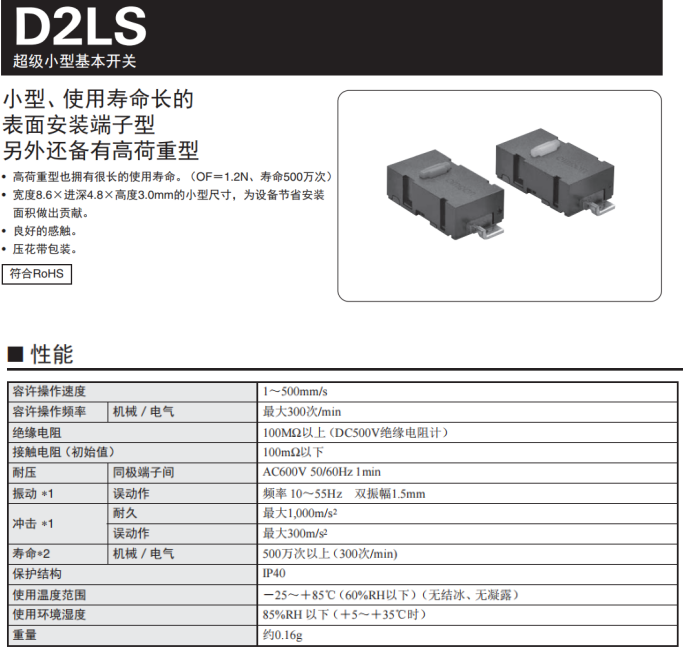 歐姆龍D2LS系列開關,高荷重型也擁有達到500萬次的電氣壽命,超級小型身材,寬度8.6*進深4.8*3.0mm尺寸,為設備節省安裝面積,觸感良好,容許操作速度1~500mm/s,操作頻率最大300次/min,重量僅有0.16g。