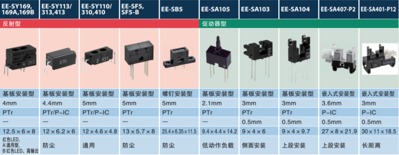 例如在打印機、智能設備、工業機械等設備上可以使用EE-SX1088,EE-SX1041,EE-SF5和EE-SX1081,這幾款小體積槽型和對射式光電開關,驅動功耗低、靈敏度高,輸出電流高低,超小的超寬。