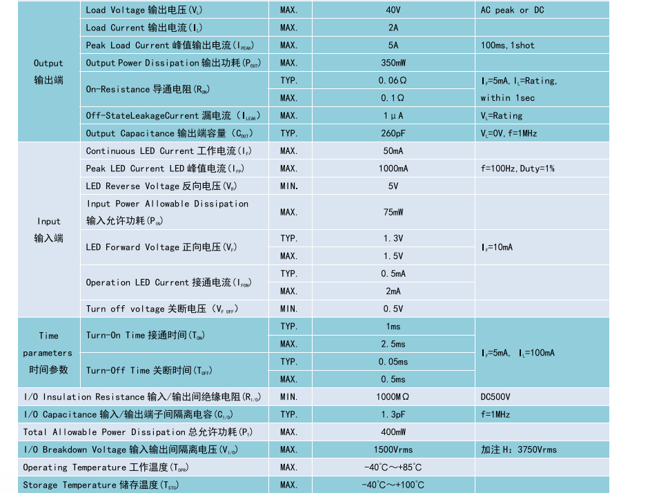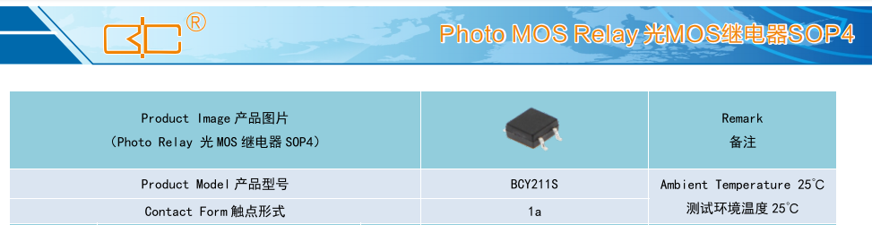 Relay 光MOS 繼電器 SOP4, Product Model產品型號:BCY211S, Contact Form觸點形式:1a, Ambient Temperature 25C, 測試環(huán)境溫度 25℃C