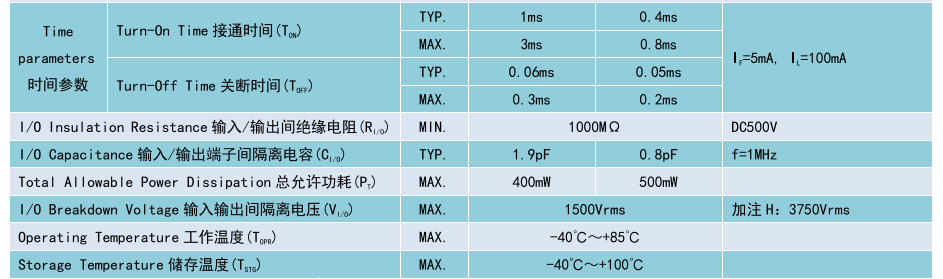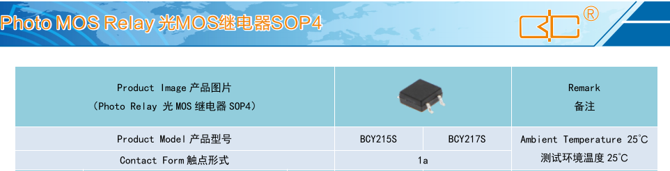 (Relay 光MOS 繼電器 SOP4),Product Model產品型號:BCY215S、BCY217S,Contact Form 觸點形式:1a,Ambient Temperature 25'C,測試環境溫度 25°℃