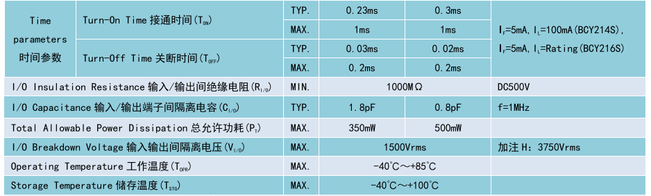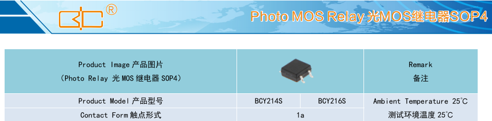 (Relay 光 MOS 繼電器 SOP4),Product Model產品型號:BCY214S/BCY216S,Contact Form觸點形式:1a,Ambient Temperature 25°C,測試環境溫度 25°C