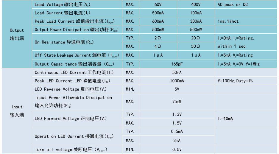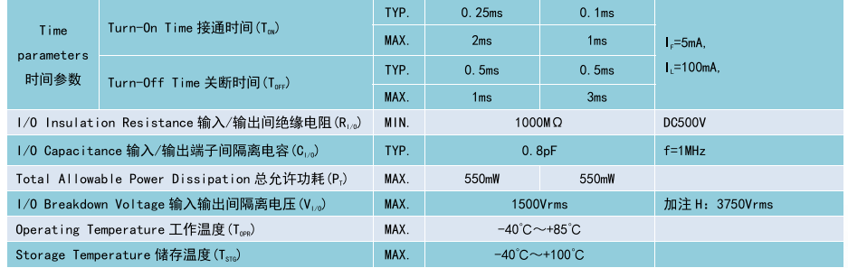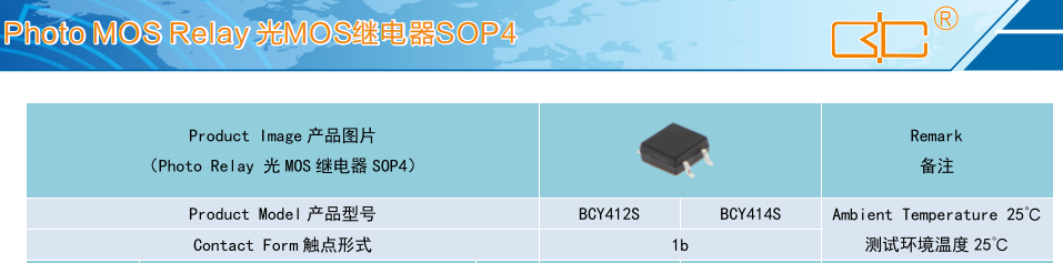 (Relay 光 MOS 繼電器 SOP4),Product Model產(chǎn)品型號:BCY412S、BCY414S,Contact Form 觸點形式:1b,Ambient Temperature 25°C,測試環(huán)境溫度 25℃