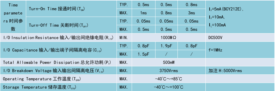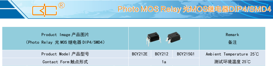 (Relay 光 MOS 繼電器 DIP4/SMD4),Product Model產品型號:BCY212E/BCY212/BCY215G1,Contact Form觸點形式:1a,Ambient Temperature 25C,測試環境溫度 25℃
