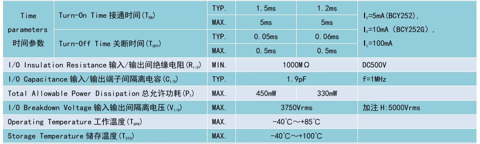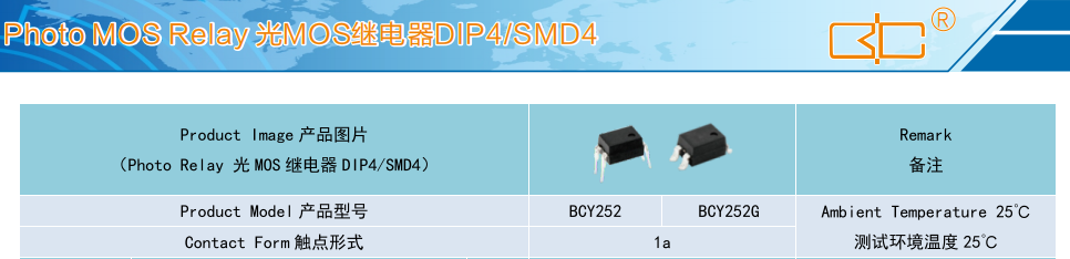 (Relay 光 MOS 繼電器 DIP4/SMD4),Product Model產品型號:BCY252、BCY252G,Contact Form 觸點形式:1a,Ambient Temperature 25°C測試環境溫度 25℃