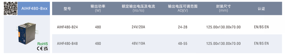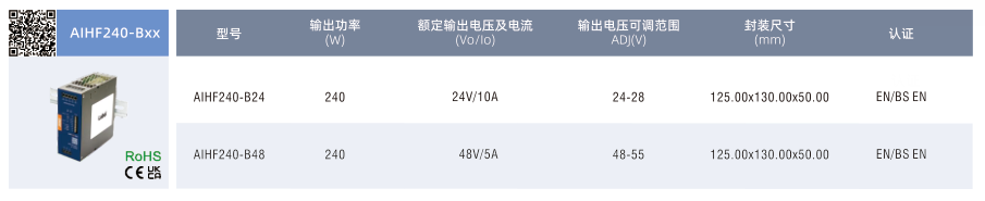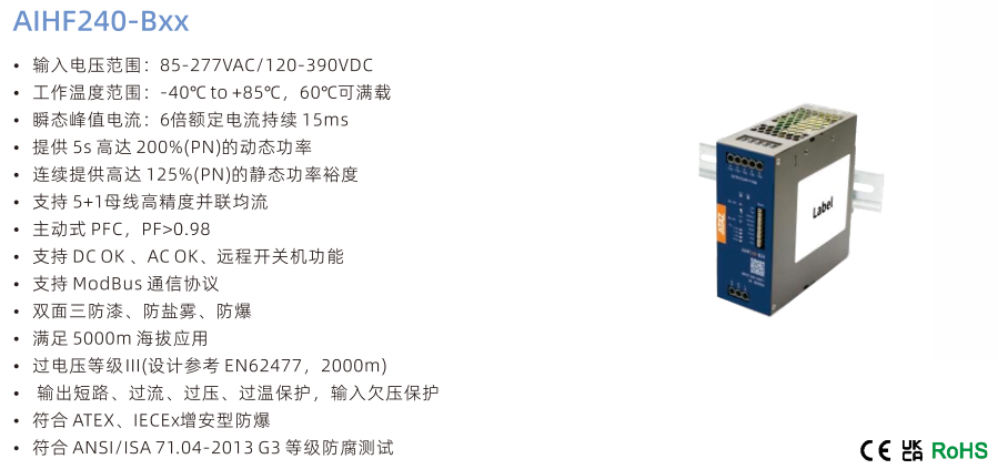 開關電源AIHF240-BxX, ?輸入電壓范圍:85-277VAC/120-390VDC ?工作溫度范圍:-40℃to+85℃,60℃可滿載 ?瞬態峰值電流:6倍額定電流持續15ms ?提供 5s 高達 200%(PN)的動態功率 ?連續提供高達125%(PN)的靜態功率裕度 ?支持 5+1母線高精度并聯均流 ?主動式 PFC,PF>0.98 ?支持 DCOK、ACOK、遠程開關機功能 ?支持 ModBus 通信協議 ?雙面三防漆、防鹽霧、防爆 ?滿足 5000m 海拔應用 ?過電壓等級I(設計參考EN