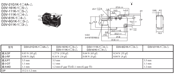 短擺桿型 內部安裝 1.96N {200gf} D3V-161-1□5-△ D3V-161-2□5-△ D3V-161-3□5-△