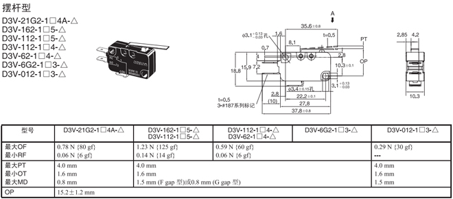 擺桿型 內部安裝 1.23N {125gf} D3V-162-1□5-△ D3V-162-2□5-△ D3V-162-3□5-△