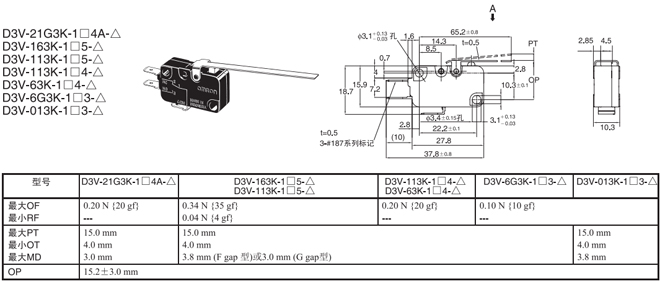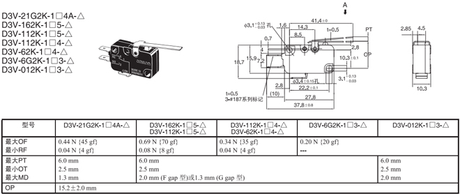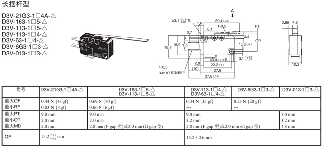 長擺桿型 內部安裝 0.44N {45gf} D3V-21G3-1□4A-△ D3V-21G3-2□4A-△ D3V-21G3-3□4A-△