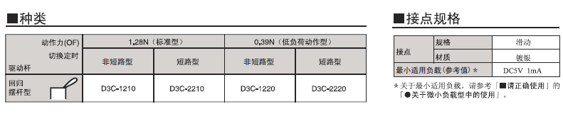 D3C 超級小型檢測開關 采用滑動式的超小型開關 超小型(高6×寬8×深4.2mm),輕量(約0.3克),3mm的長行程。 由于是滑動方式,所以短路、非短路的切換時間可根據使用用途進行選擇。