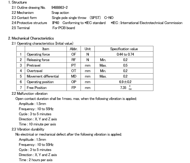 D2FC-F-7N, 克力為:60+/-15G,壽命為500萬次;